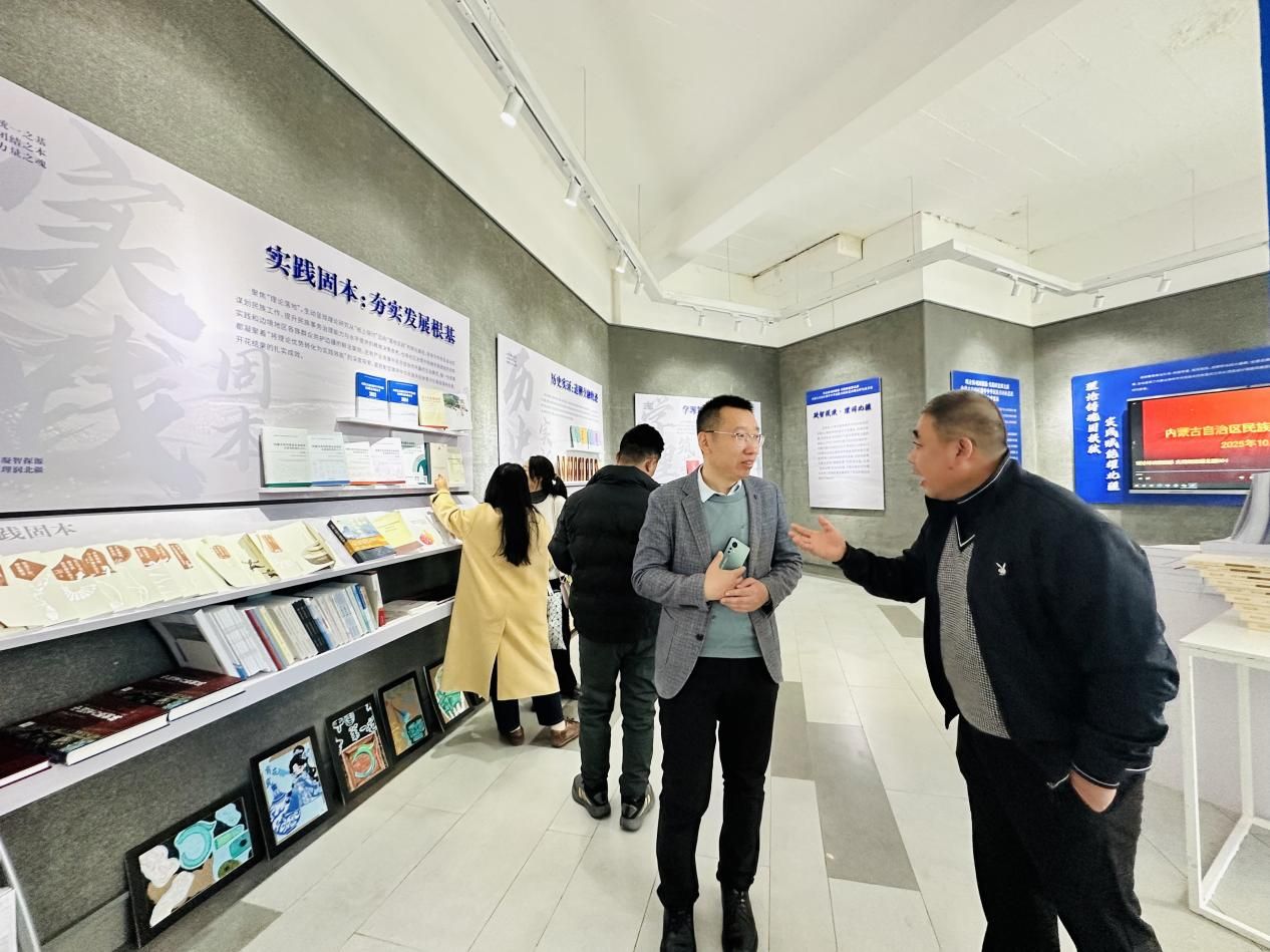 研学人员一行观看了“理论铸魂固根脉 实践赋能耀北疆”为主题的宣传教育纪录片,参观了理论研究成果展区、理论指导实践成果展区、文创成果展区、数字成果展区等,特别关注到公司铸牢中华民族共同体意识研究领域的代表性成果,在研学中不断凝聚共识,研讨中继续开拓思路。