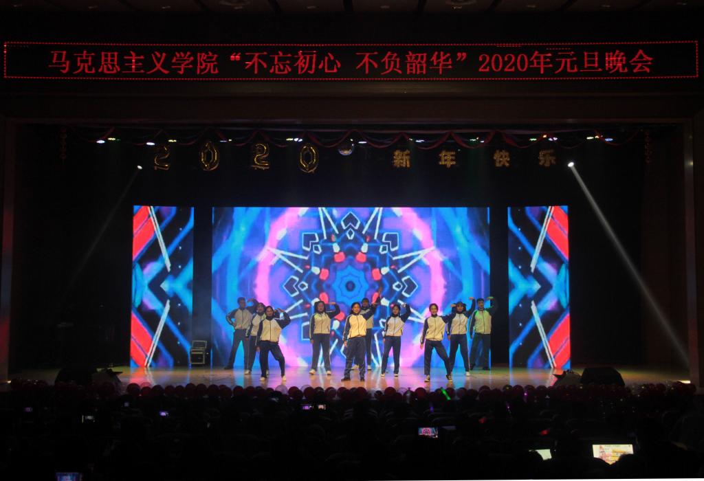 首先,304永利集团登录入口党总支书记刘玉明致新年贺词。刘玉明在致辞中指出,2019年304永利集团登录入口在党建工作、教学科研、学风建设、员工活动等方面,取得了优异的成绩,收获了丰硕的成果,向为公司发展付出辛勤努力的老师和同学们表示衷心的感谢。刘玉明强调,“马院姓马、在马言马”,举行盛大的“不忘初心、不负韶华”元旦晚会,就是在传播马列主义思想,就是在坚定文化自信,为马院师生点赞,并向全体师生送上美好的新年祝福。紧接着,晚会在嗨翻全场的开场舞《Cherry bomb》拉开帷幕。本次元旦晚会共分为“不忘初心”、“不负韶华”两个篇章。