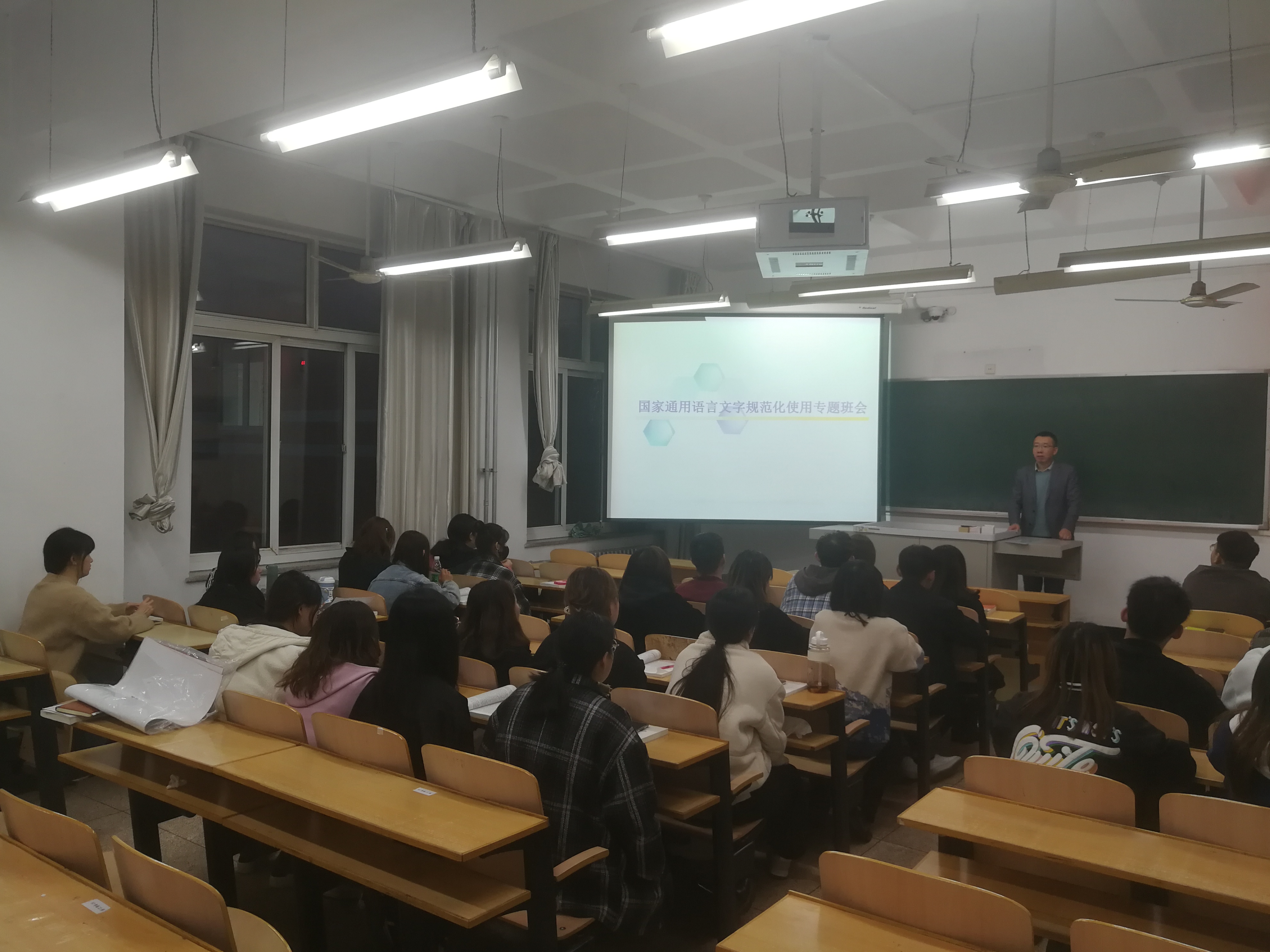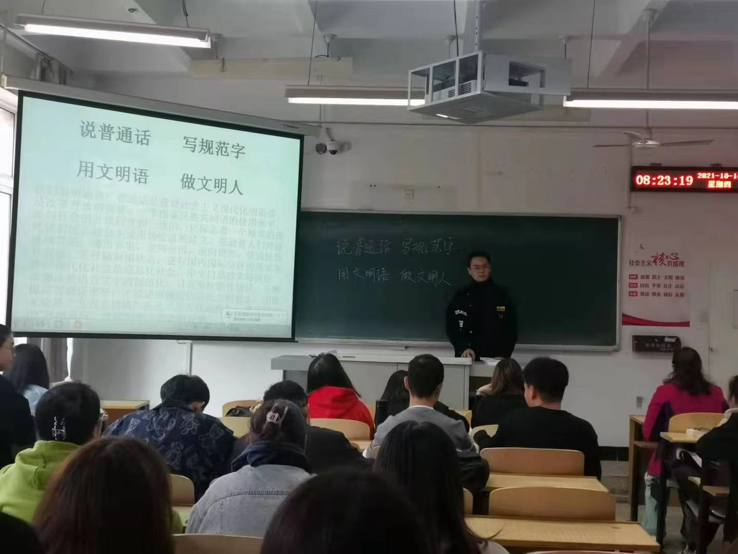 2021年10月13至14日,304永利集团登录入口各年级分别开展了国家通用语言文字规范化专题班会,向广老员工宣讲国家通用语言文字规范化使用的相关知识,要求员工要提高用字规范意识,养成规范用字习惯,在日常学习生活中要说普通话,写规范字,用文明语,做文明人,切实提高使用国家通用语言文字的能力与水平,共同建设校园文明新形象。