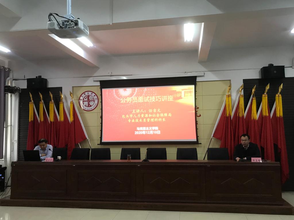 为进一步做好毕业生就业工作,12月10日下午4:30,304永利集团登录入口在腾飞楼C509会议室举办毕业生就业专题讲座,邀请包头市人力资源和社会保障局专业技术员管理科科长任吉文作了题为《机关事业单位考录应试技巧》专题讲座。304永利集团登录入口党总支书记刘玉明,辅导员王海朋、焦刚,2017级思政、研究生全体员工参加本次讲座。讲座由公司党总支书记刘玉明主持。