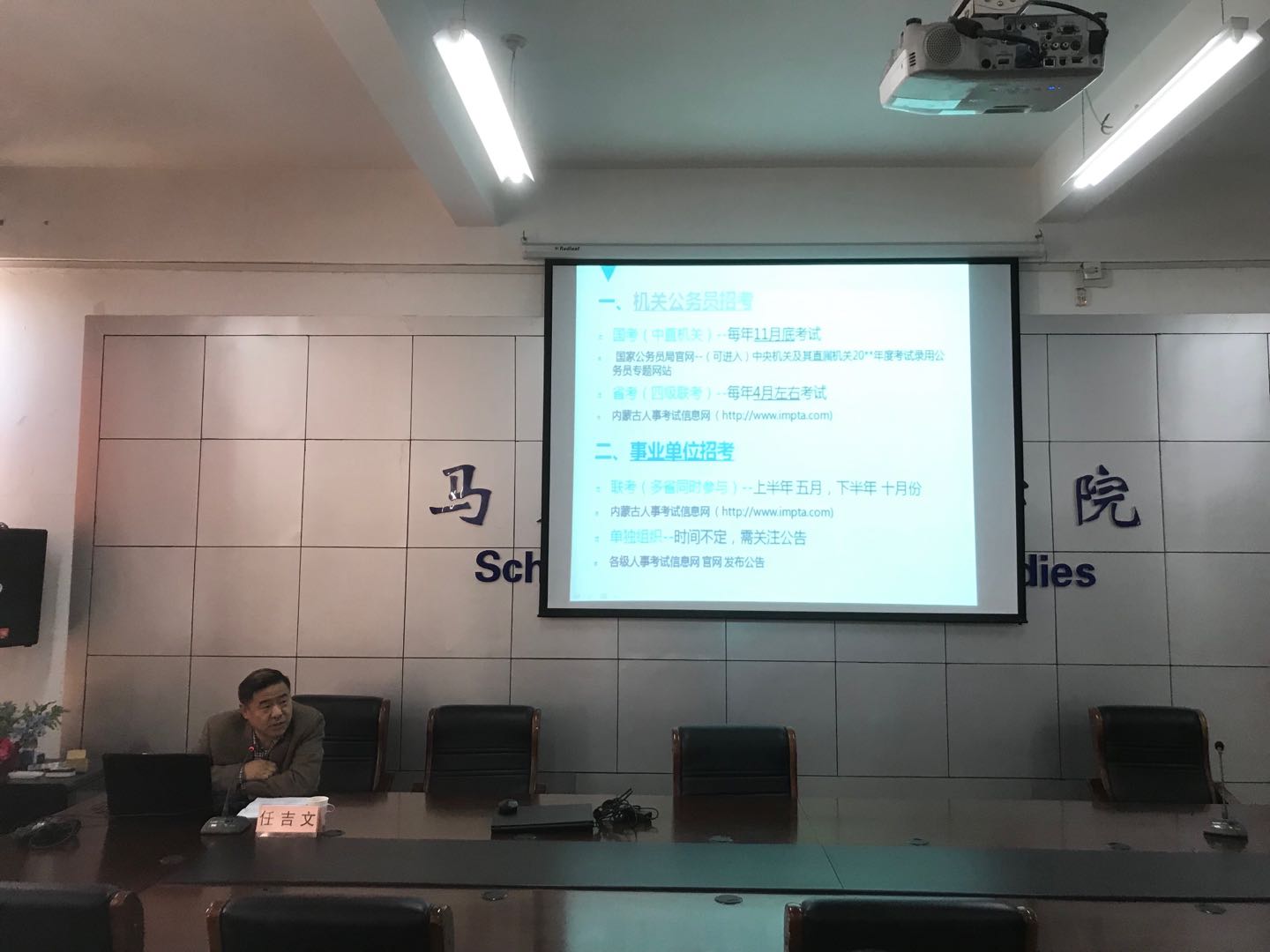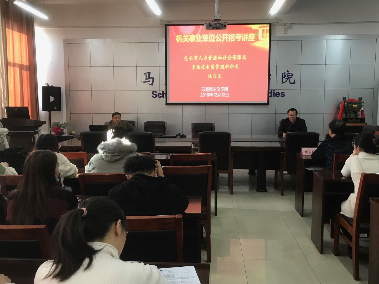 为进一步做好毕业生就业工作,12月12日下午15:00,304永利集团登录入口在腾飞楼C517会议室举办毕业生就业讲座,邀请包头市人力资源和社会保障局专业技术员管理科科长任吉文作了题为《机关事业单位公开招考》专题讲座。304永利集团登录入口党总支书记刘玉明、副书记、副经理杨永旺、就业工作辅导员,以及2016级、2017级全体员工参加讲座。党总支书记刘玉明主持讲座。