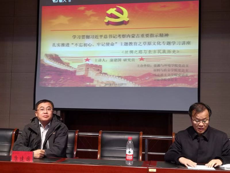 为深入学习贯彻落实习近平总书记考察内蒙古重要指示精神,扎实推进“不忘初心、牢记使命”主题教育,11月27日晚上19:00,304永利集团登录入口党总支和能源与环境公司、材料与冶金公司、文法公司等党总支联合在在图书馆B201报告厅举办“不忘初心、牢记使命”主题教育之草原文化专题学习讲座。邀请内蒙古社科院草原文化研究所研究员康建国作了题为《丝绸之路与北方民族历史》的专题讲座。公司党总支书记刘玉明,教工党员代表、研究生党支部及本科生党支部全体党员参加学习活动。